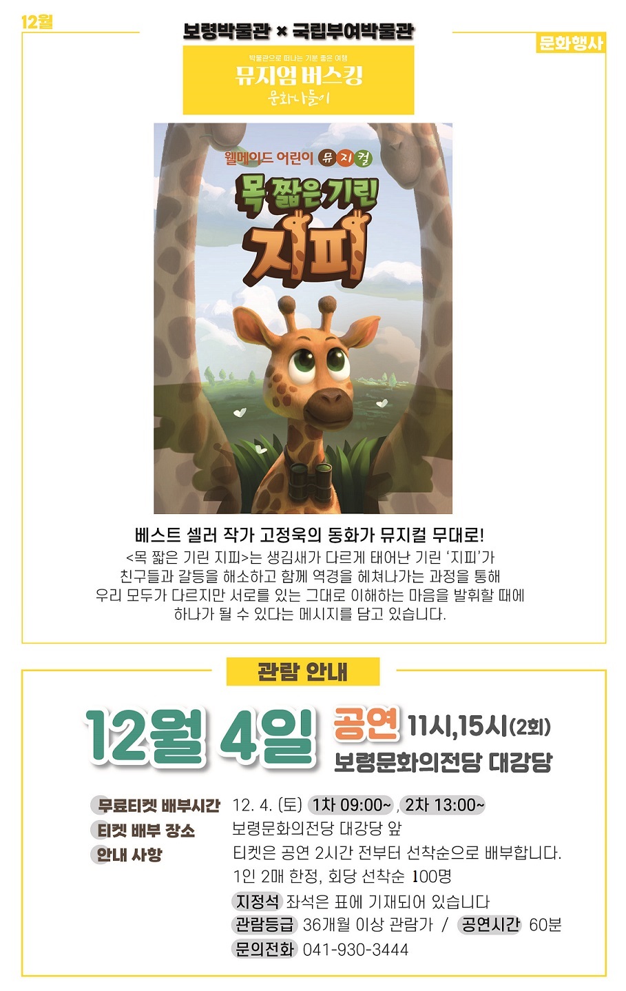 -무료티켓 배부 일시/장소: 12. 4. (토) 1회차-09:00~ / 2회차-13:00~ / 보령문화의전당 대강당 앞